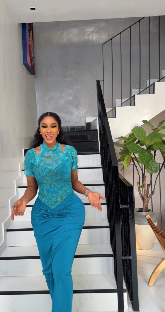 Yellow Batik short mesh gown paired with a black long strechy skirt
