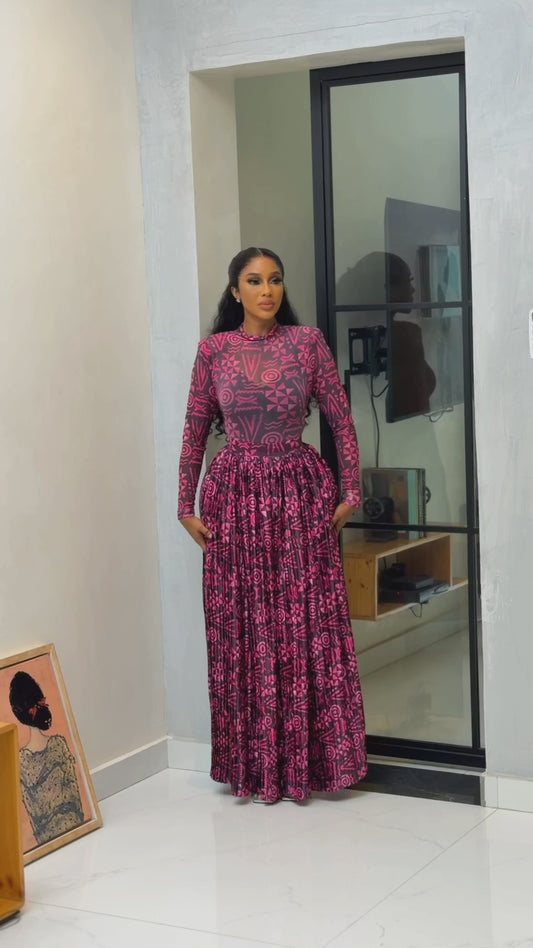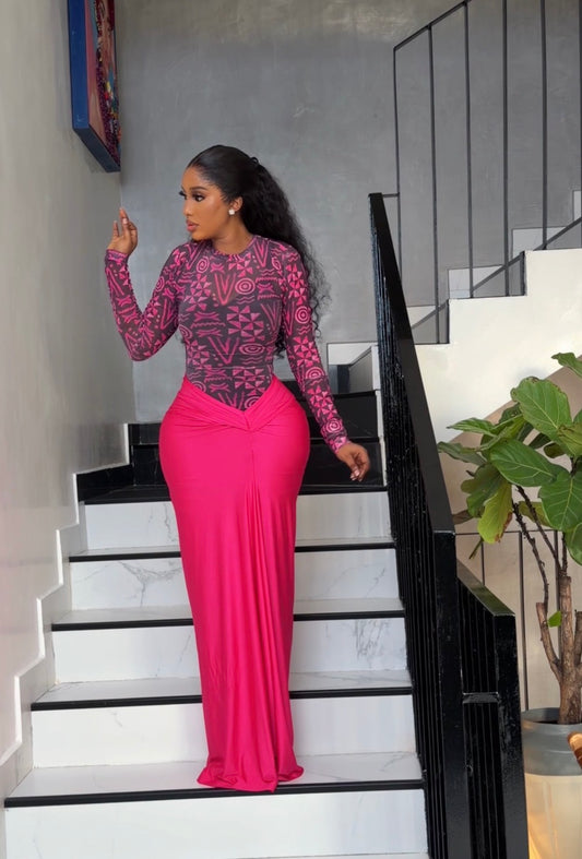 Pink Batik short mesh gown paired with a pink long strechy skirt